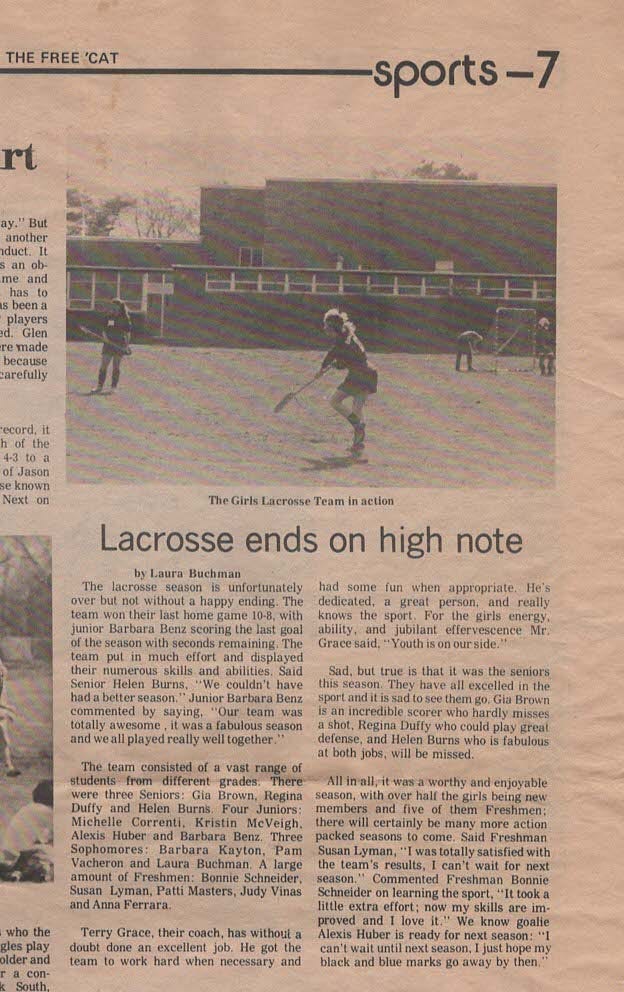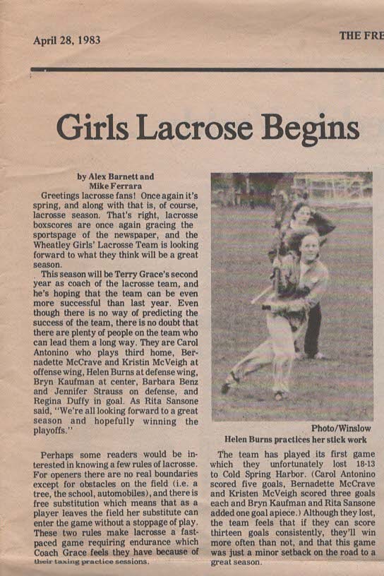 Helen Burns Olsson (1984) Writes - “Hi Art, I was going through an old box and found a copy of the April 28, 1983, issue of The Free ‘Cat, which includes an article on Wheatley’s nearly brand-new Women’s Lacrosse Team. (Big typo on the headline!) I believe this was from the second season of women’s lacrosse at Wheatley. In our inaugural year, not one player had ever played the game before, which is an experience that stays with me. We had a blast under Coach Terry Grace. We didn’t have much of a budget, and we cobbled together our gear. Bernadette McCrave (1983) often played goalie, and she wrapped newspapers around her legs under her sweatpants to mitigate blows to the leg, and she hung a men’s cup from the bottom of her helmet to protect her neck. Great memories from those days!