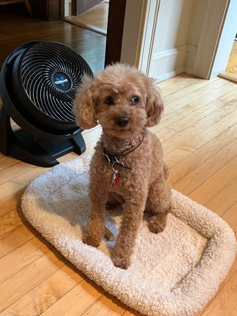 Rocky, Judy Lutrin Sidran’s (1965) 12-year-old 10-pound poodle, cooling by the fan.