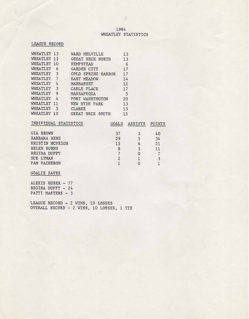 I’m attaching stats from the 1982 and 1984 seasons. I haven’t seen those names in decades! Pam Phalen, Carol Antonino, and Maureen Leary were the high scorers in 1982. High scorers in 1984 were Gia Brown 1984, Barbara Benz 1985, and Kristin McVeigh 1985. That was a rough year, with a 2-10 record.