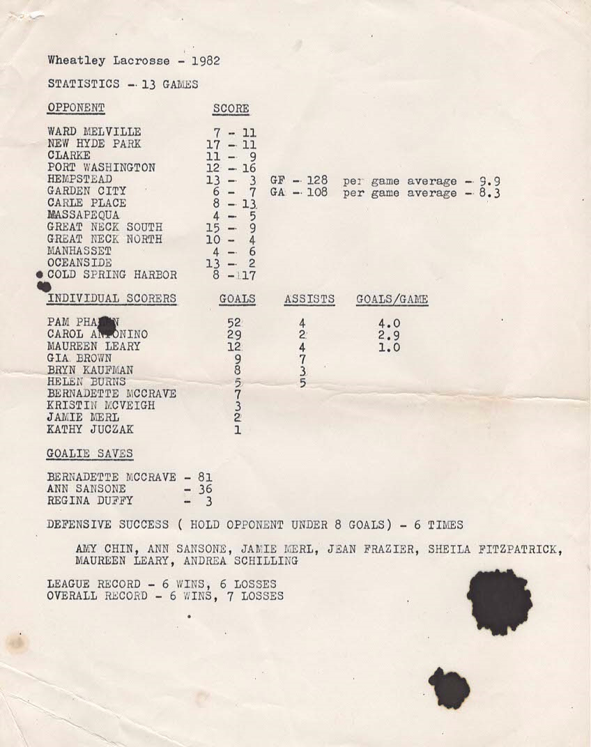 Helen Burns Olsson Continues - “The 4/28/83 article above says that our practices were ‘taxing.’ I’m not sure how ‘taxing’ they really were! Sure, we ran up and down the field during practice at Wheatley, but I don’t remember ever running more than a mile at a time as conditioning. I went on to play lacrosse (and field hockey) at Hamilton College. Freshman year, I just about died when our coach had us run a 5-mile ‘fun run’ during preseason.